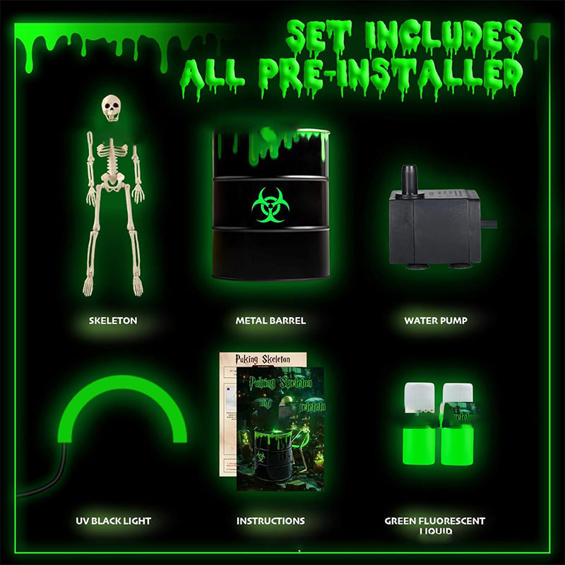 LJUSANDE EFFEKTER MED UV-LJUS: Den gröna fluorescerande vätskan reagerar starkt på UV-ljuset, medan vattenpumpen skapar en bubblande rörelse. Tillsammans skapar de en realistisk glödande effekt som ger en magisk atmosfär till dina Halloween-dekorationer.