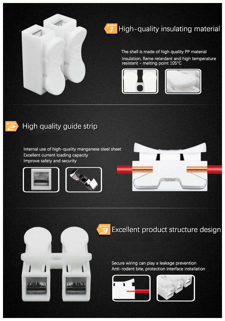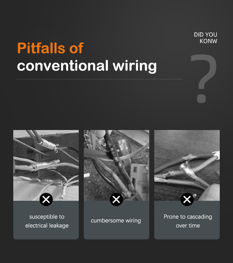 Bekväm att använda: Snabb kabelanslutning utan att borra skruvhål påskyndar kabeldragningsprocessen, mycket bekvämt. Kan användas utan tvekan.