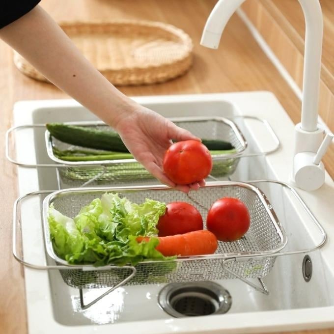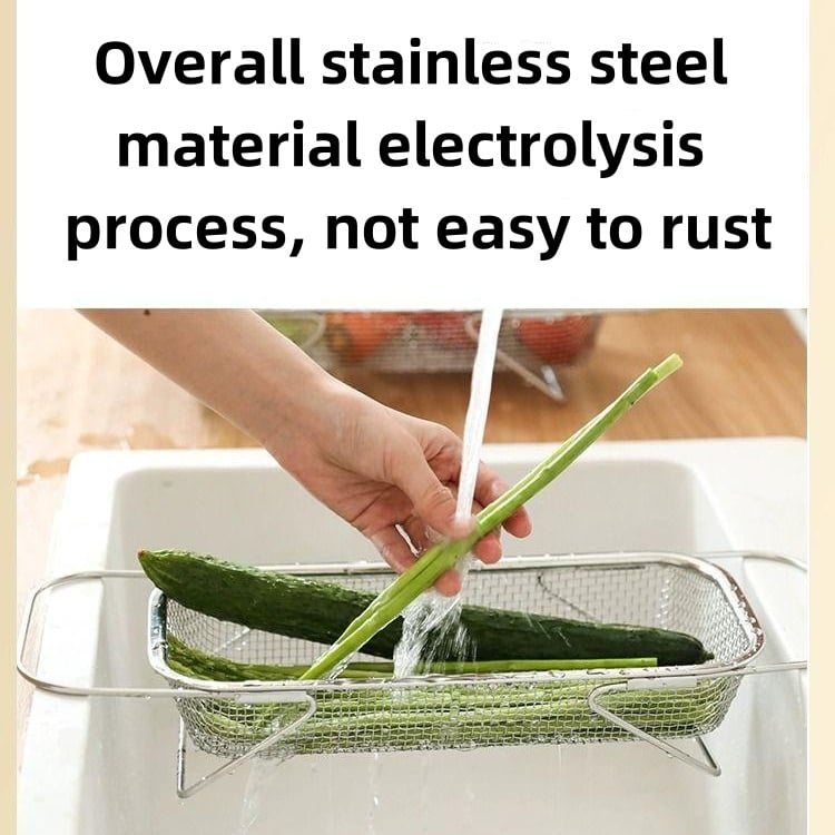 🥦🍎Multifunktionell och platsbesparande:Detta mångsidiga dräneringsställ fungerar både som diskställ, grönsakstvätt och fruktkorg. Dess hopfällbara design gör det lätt att förvara, vilket sparar värdefullt bänkutrymme när det inte används.